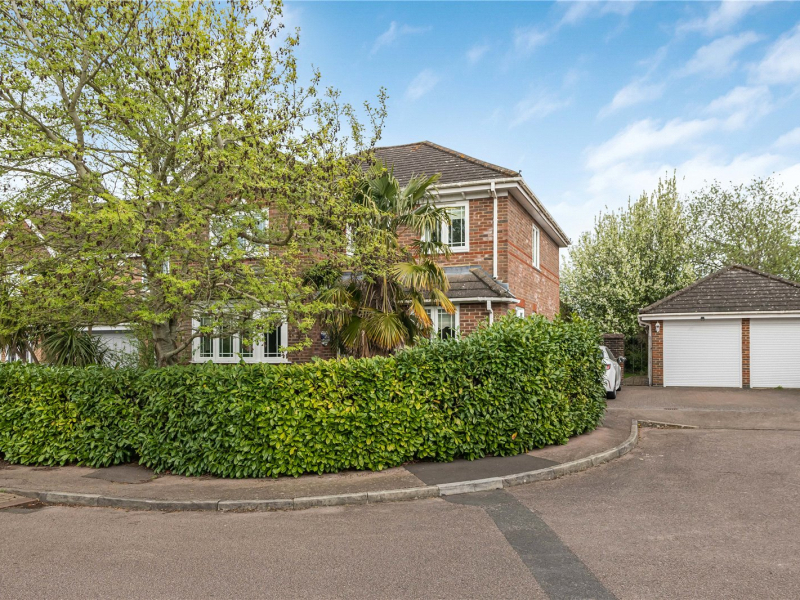 To the front of the property, there is off-road parking for up to three cars, along with access to the double garage. The low-maintenance front garden is complemented by mature shrubs, providing added privacy.