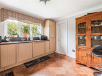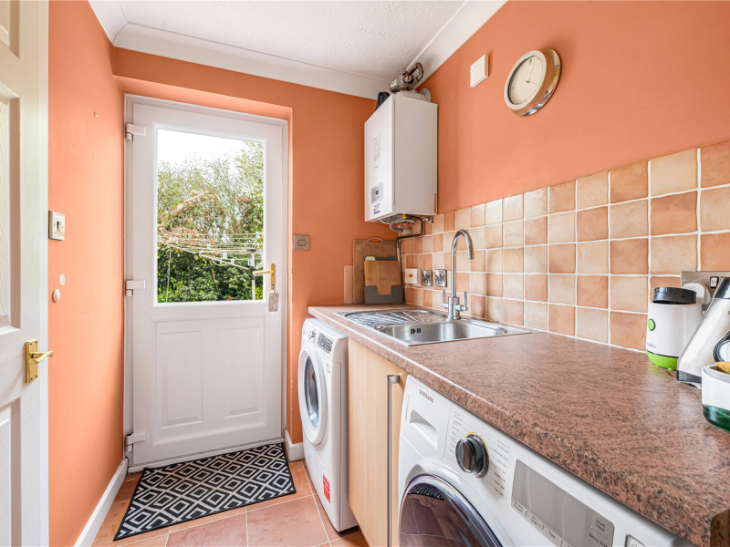 The kitchen is well-equipped with a range of built-in appliances, including a dishwasher, fridge/freezer, oven, microwave, and gas hob. The adjoining utility room provides additional space for a washing machine and tumble dryer, houses the boiler, and offers a large storage cupboard.