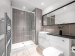 The next floor features another spacious double bedroom, with dual-aspect windows flooding the room with natural light. This bedroom benefits from its own en-suite shower room, complete with a walk-in shower, toilet, and wash basin.