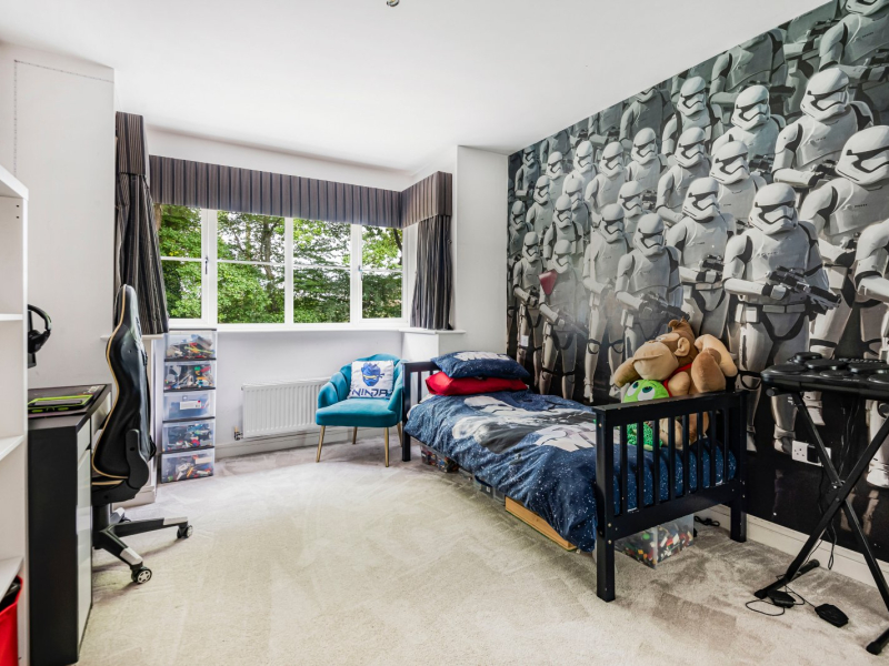 Upstairs, the well-designed layout continues to impress. The Master Bedroom and Bedroom 3 overlook the beautifully landscaped south-facing garden, with the Master enjoying a private ensuite bathroom and a walk-in wardrobe. The ensuite features a freestanding bathtub, a separate walk-in shower, sink, and toilet, creating a luxurious retreat. The family bathroom includes a bathtub with a handheld shower, a sink, and a toilet, serving the remaining bedrooms. Bedroom 2, with its large bay window overlooking the front of the property, also benefits from its own ensuite shower room, providing a peaceful escape. Bedroom 4, a versatile room, could serve as a small double or a spacious single, depending on your needs.