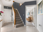 The exterior is framed by mature trees and shrubs, offering privacy and a welcoming ambiance. The driveway accommodates multiple vehicles, while the electric gates provide added security. Stepping inside, you are greeted by a spacious hallway, with elegant porcelain flooring that sets the tone for the rest of the home. The hallway leads to various reception rooms, a convenient downstairs WC, and an under-stair storage cupboard. A graceful winding staircase takes you to the upper floor, where four generously proportioned double bedrooms await.