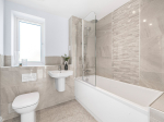 The first floor boasts a spacious landing that separates Bedrooms 3 and 4, both of which feature stunning views of the surrounding greenbelt. Positioned between the two bedrooms is a stylish family bathroom, fitted with a modern suite that includes a bathtub, a sleek vanity unit, and a built-in toilet cistern. The landing also provides access to the staircase leading to the top floor.