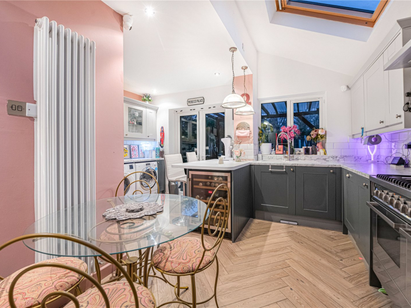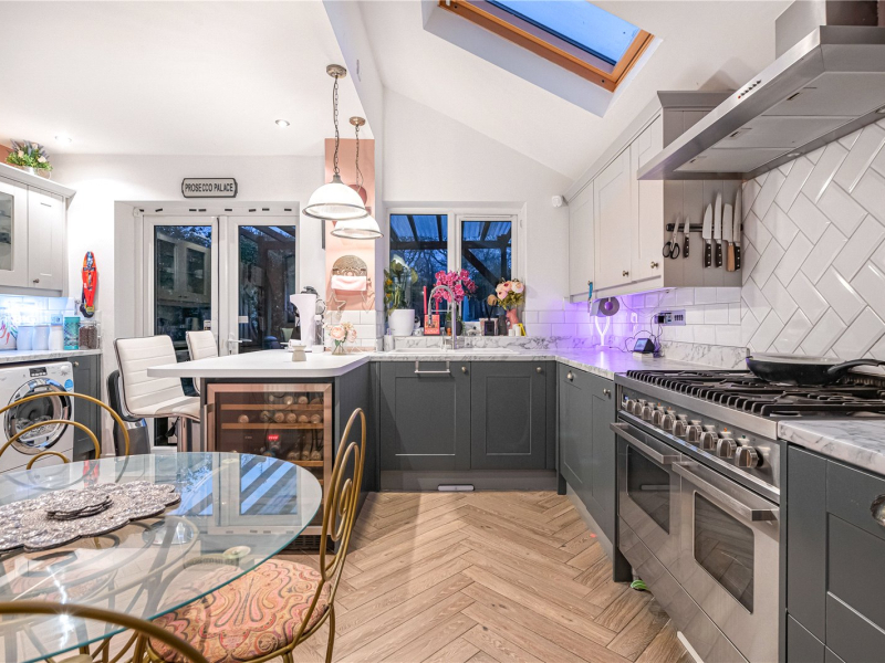 The hallway offers under-stairs storage, access to the ground floor W/C, and a staircase leading to the first-floor accommodation. The kitchen/breakfast room is well-appointed with ample wall and base units, generous worktop space, and integrated appliances including a dishwasher and wine cooler, with additional space for a large oven, washing machine and tumble dryer. French doors open directly onto the rear garden, making it ideal for entertaining.