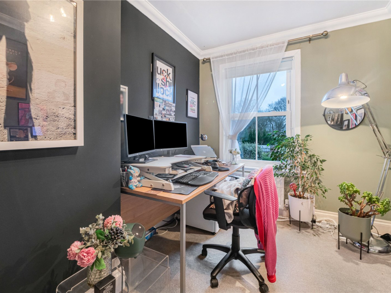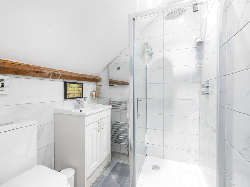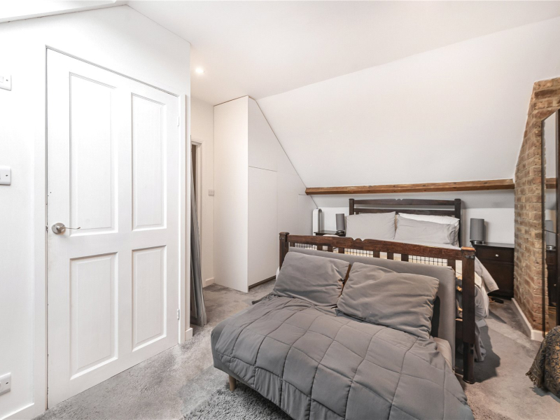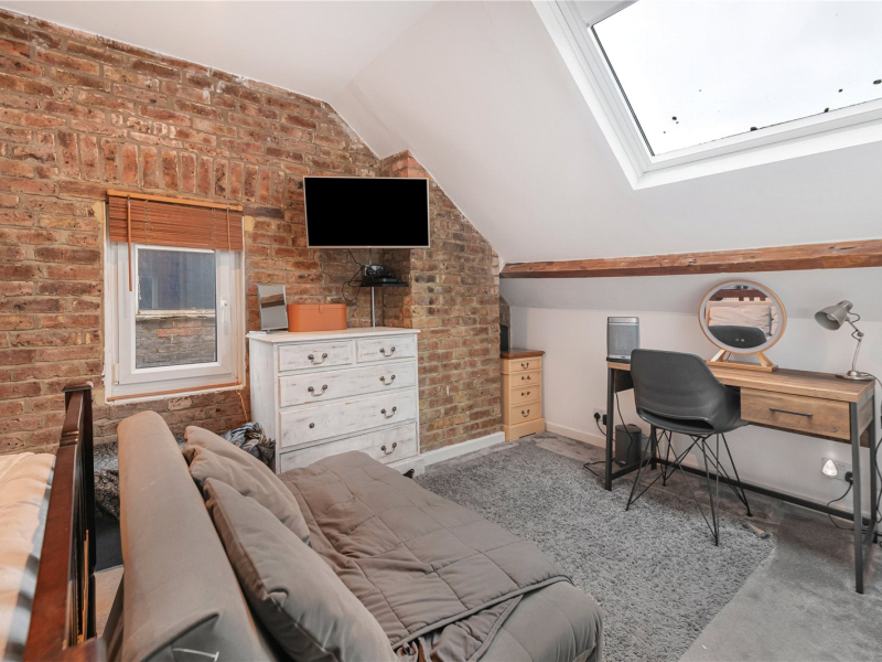 The top floor is dedicated to an impressive principal bedroom, complete with built-in storage, exposed brickwork and a modern en-suite shower room with walk-in shower, WC and wash basin.