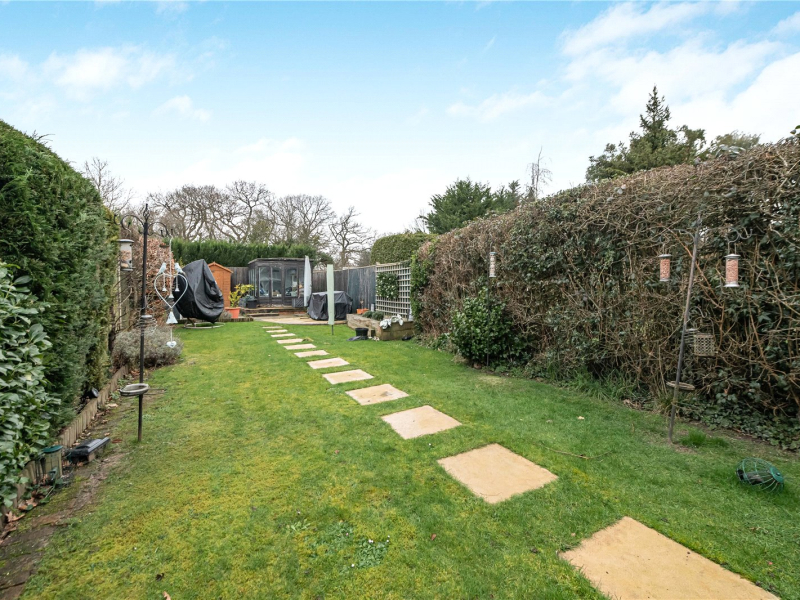 Externally, the private rear garden is mainly laid to lawn with mature shrubs and bushes bordering the sides. A pathway leads to a decked seating area at the rear, where you’ll find a garden shed and summer house.