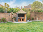 The recently landscaped south-east facing rear garden, features a full-width Italian porcelain patio leading to a turfed lawn area, accented by low-rise brick walls with inset flower beds and lighting. Palm trees and specimen trees, adorn the space, with a stepping stone path leading to a sizable timber shed on a concrete base. Additionally, the sellers have recently installed a Thatched Gazebo for entertaining and enjoying the garden all year round, with heating and lighting. Outdoor amenities include a wall-mounted heater, tap, and power outlets, while attractive tall brick walls and mature hedging ensure privacy and seclusion.