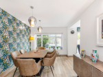 The front of the property features a generous driveway for parking and turning several cars on, a gate for security and privacy, as well as a landscaped front garden with patioed seating area, for enjoying that last lot of summer-sun. Upon entry, a tastefully appointed and spacious entrance hall welcomes with a staircase leading to the upper level and a recently remodelled cloakroom. The living room, featuring polished parquet floor, a set of stunning stain-glass windows to the Garden room, overlooks the front and showcases a contemporary fireplace with a newly installed wood burner in 2023. There are also patio doors to the side, providing easy access to both the rear and front gardens.