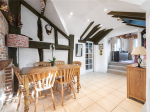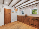 Upon entering the property, a useful porch provides practical storage for coats and shoes before leading into the impressive kitchen/dining area, which truly forms the heart of the home. This contemporary yet sympathetic space is fitted with a shaker-style kitchen featuring a built-in oven and hob, space for a dishwasher, and room for a large fridge/freezer. There is ample space for a dining table, set beneath vaulted ceilings with exposed brickwork and exposed wooden beams, all of which beautifully enhance the home’s period charm.