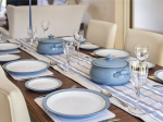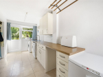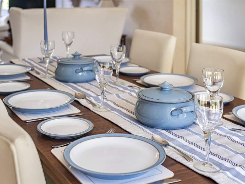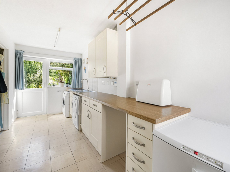 The kitchen includes plenty of cupboard space with both over- and under-counter units, plumbing for a dishwasher, space for a fridge or freezer, and integrated appliances such as a gas hob, oven, and microwave. There’s also space for a dining table. Off the kitchen is the utility room, which has power and plumbing for a washing machine, dryer and an American sized fridge freezer. There is a stainless steel sink, built-in storage, and access to both the rear garden and garage.