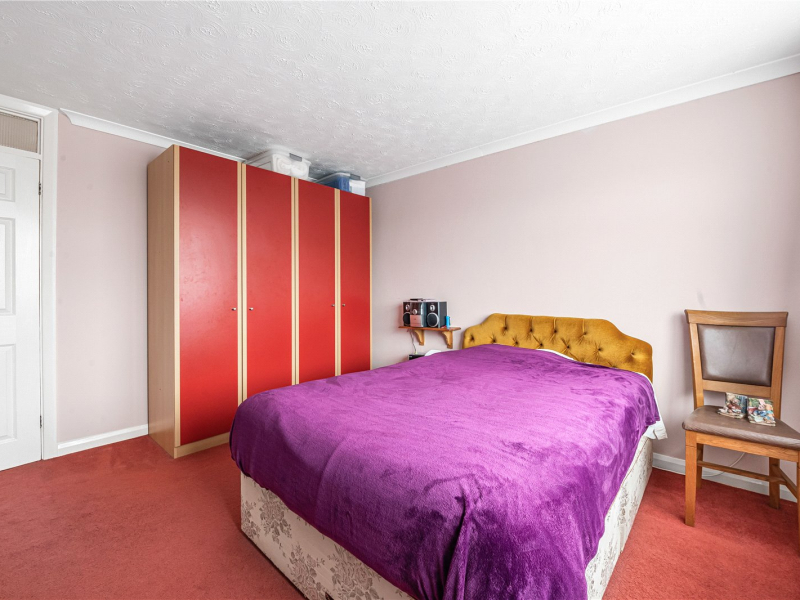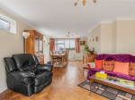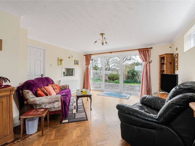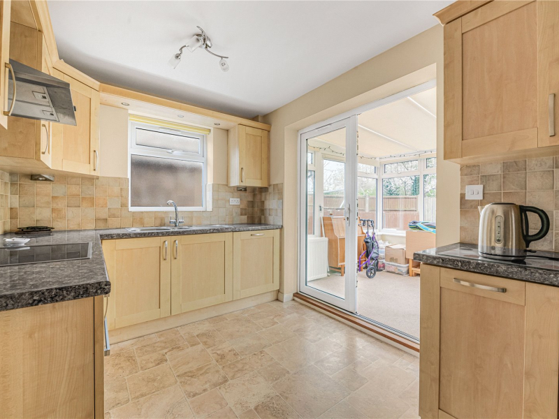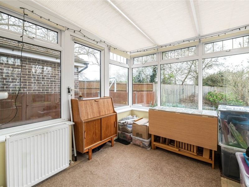 The living room is generously sized, featuring dual-aspect windows and sliding doors opening onto the garden, allowing plenty of natural light and providing ample space for freestanding furniture. The kitchen is well-appointed, offering a range of wall and base units alongside integrated appliances including a dishwasher, oven, hob, fridge and freezer. It leads through to a conservatory, which serves as an additional reception room overlooking the garden. A convenient downstairs W/C completes the ground floor.