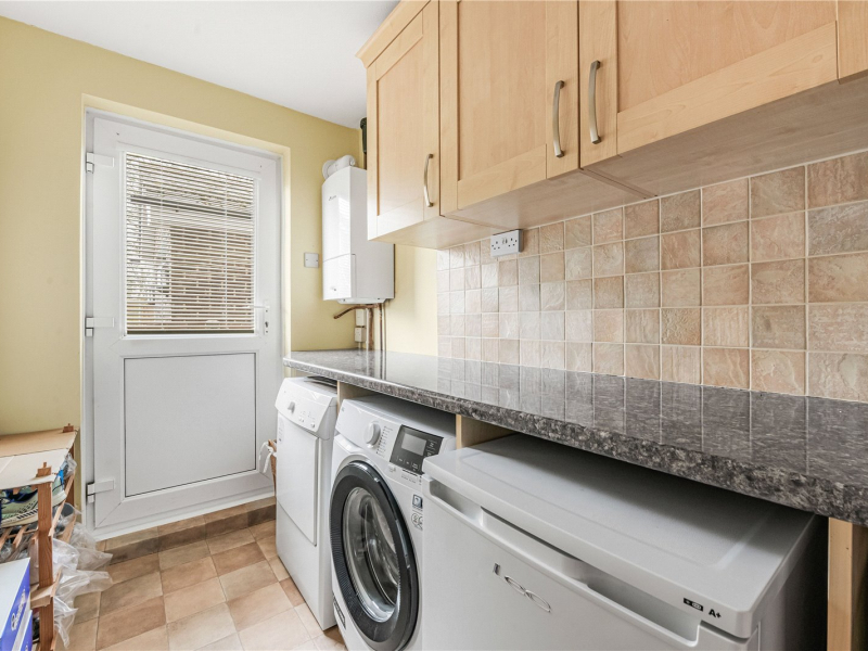 Upon entering, a welcoming hallway provides access to the first floor and includes a useful storage cupboard, ideal for coats and shoes. To the left, there is a bright study with dual-aspect windows, creating an excellent work-from-home space. Adjacent to this is a utility room, offering plumbing for a washing machine, space for additional appliances, and housing the boiler.
