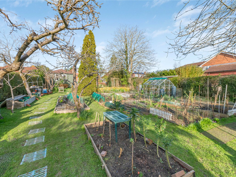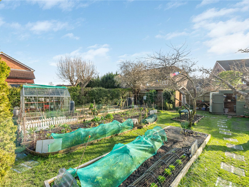 The impressive south-facing garden offers ample space to enjoy the outdoors all year round. Mature shrubs and bushes border the garden, providing excellent privacy, and there are various seating areas perfect for the warmer months. Towards the end of the garden is an allotment-style area with a variety of fruits and vegetables. There is also a greenhouse, shed, and potting house, which is fitted with lighting and electricity.
