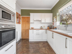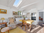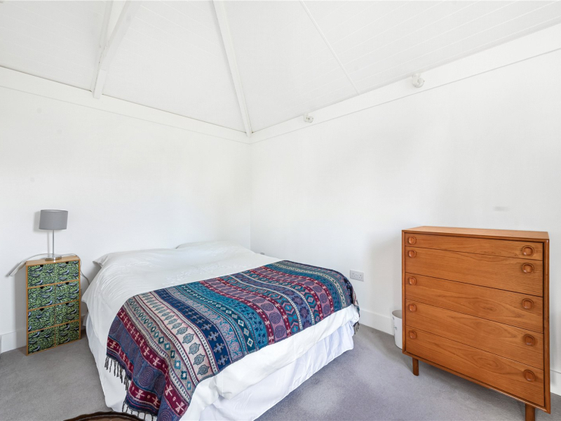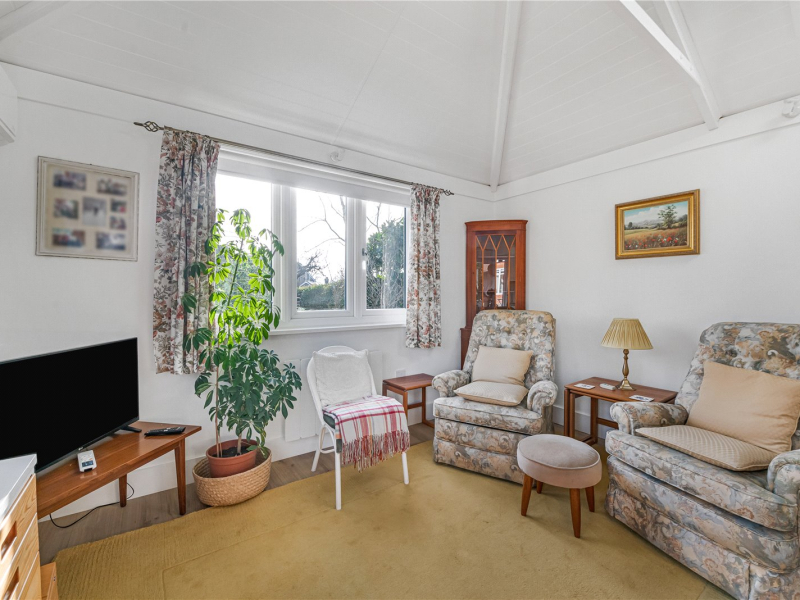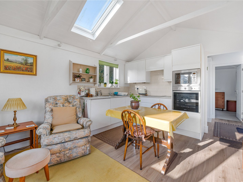 From the garden, there is access to the annexe. This features an open-plan living/kitchen/dining area fitted with an electric hob, oven, and microwave, along with ample over- and under-counter storage and an under-counter fridge. The annexe also benefits from air conditioning and cabling for TV and Wi-Fi. Triple-aspect windows flood the space with natural light. The bathroom includes a walk-in shower, toilet, and sink. The bedroom is a spacious double with room for freestanding furniture, and there is an additional storage cupboard in the hallway.