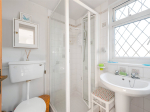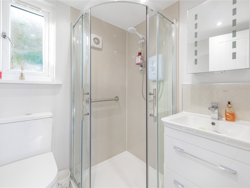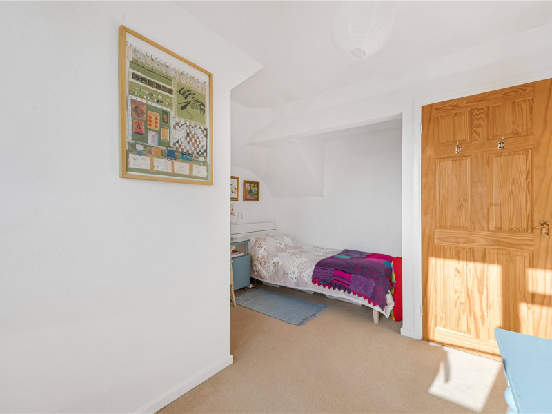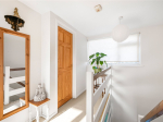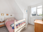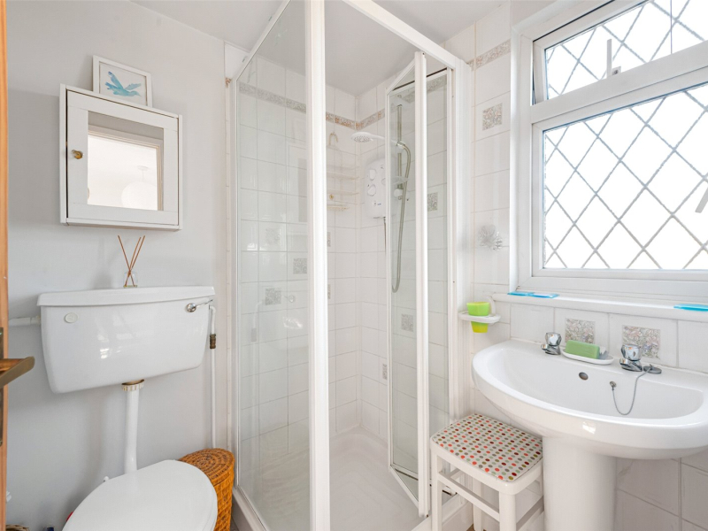 On the first floor, there are two bedrooms, both offering space for freestanding furniture along with ample eaves storage. The south-facing bedroom enjoys a bright and airy feel. There is also a second bathroom on this floor, fitted with a walk-in shower, toilet, and sink. A storage cupboard on the landing houses the boiler.