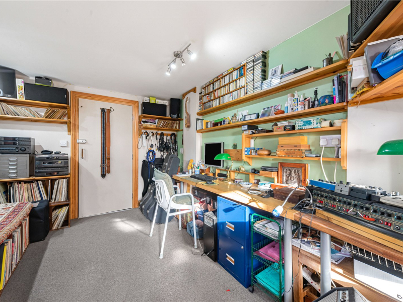 To the side of the house is a garage which has been thoughtfully converted. The front section remains as useful storage space, while the middle section is fitted with lighting and electricity, making it ideal for a home office or study area. This studio space is also fully soundproofed. To the rear, there is a workshop space which leads directly out to the garden.