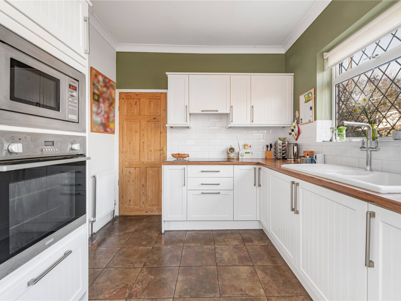 Upon entering, stairs rise to the first floor with useful storage beneath, and the hallway benefits from original oak flooring. To your right is the utility room, which has plumbing for a washing machine, a sink, and further storage space. The kitchen is fitted with neutral shaker-style units and wooden worktops, with built-in appliances including an induction hob, oven, and microwave. There is also space for a fridge/freezer and dishwasher.