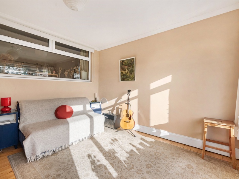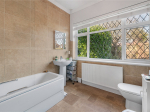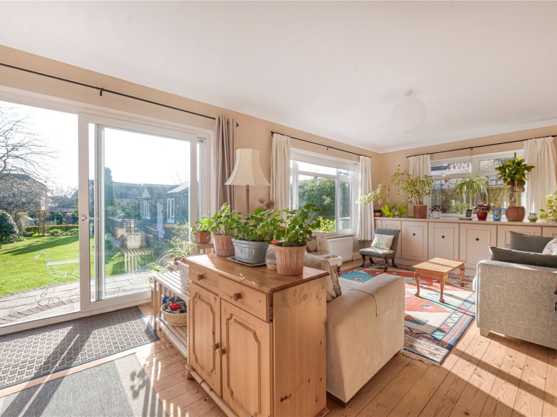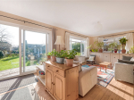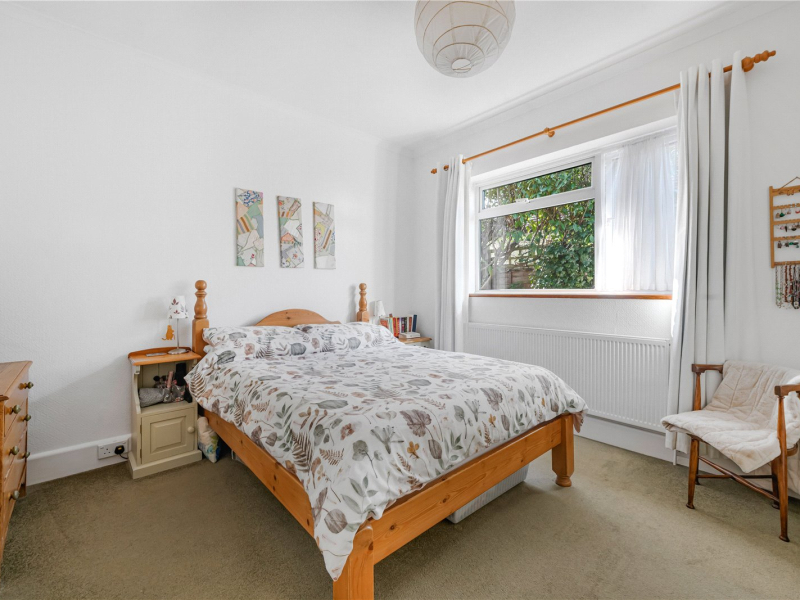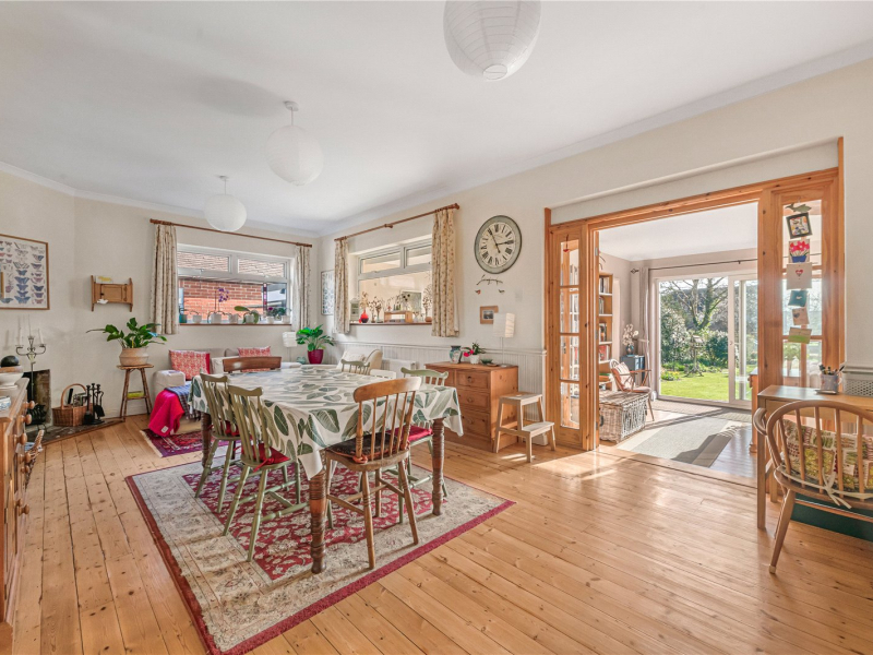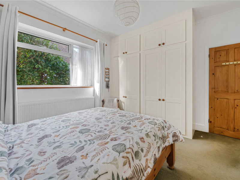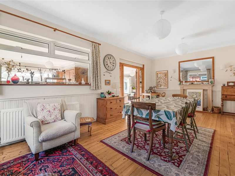The open-plan living/dining room features both an open wood-burning fireplace and a gas fire, ideal for the colder months. This room offers plenty of space for freestanding furniture. Through double doors is an additional reception room with a large, bright window to the rear and a substantial built-in storage cupboard. From here, there is access to the fourth bedroom, making it an ideal guest suite or versatile study space. To the rear of the property, there are stunning views over the garden.