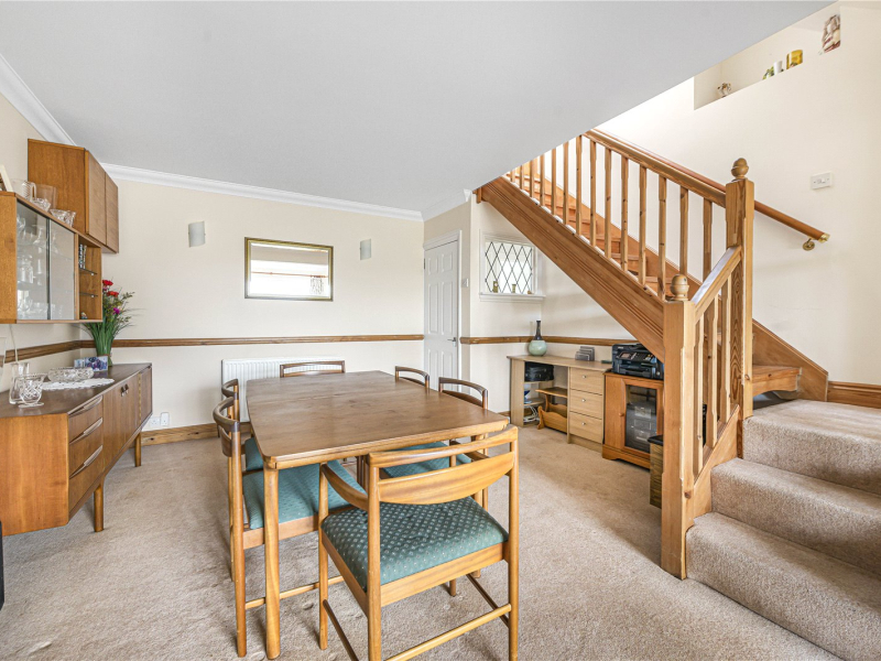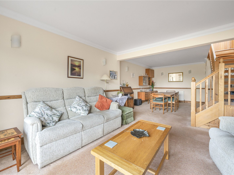 To the rear of the property is an impressive 26ft living/dining room with sliding glass doors opening onto the garden, creating an ideal space for entertaining and family living. The kitchen is accessible from both the hallway and the living area and offers a range of fitted units, an integrated fridge/freezer and space for a washing machine, dishwasher and dryer, along with a built-in oven and gas hob.