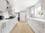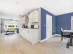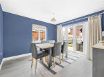 The heart of the home is the open-plan kitchen/dining/family room. A large bay window at the front adds brightness and charm to the living area. The modern kitchen is fitted with integrated appliances, including a fridge/freezer, gas hob, oven, 1.5 bowl sink, and dishwasher. Adjacent to the kitchen is the dining area, which also opens onto the rear garden via French doors. A separate utility room houses a sink, space for a washing machine, and an additional access door to the garden.
