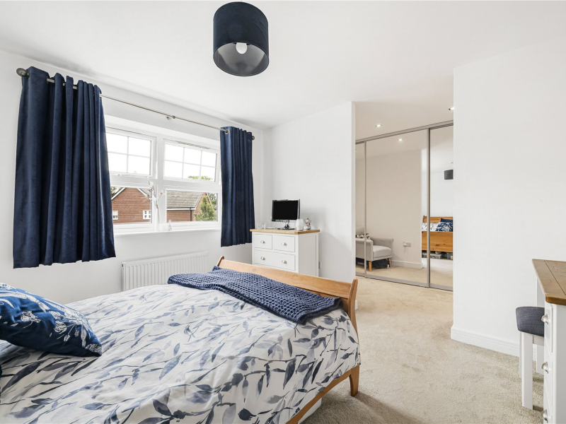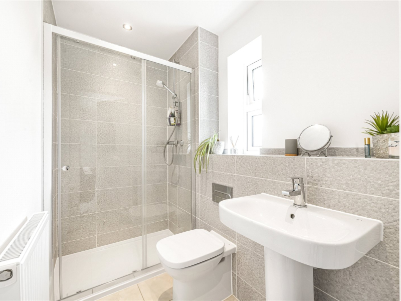 Upstairs, you’ll find four well-proportioned double bedrooms. Two of the bedrooms benefit from en-suite shower rooms, each fitted with a walk-in shower, WC, and basin. The spacious master bedroom includes a walk-in wardrobe with large mirrored wardrobes and its own en-suite. The remaining two bedrooms offer ample space for freestanding furniture. A stylish family bathroom completes the upstairs, featuring a bath, walk-in shower, WC, and basin. The landing also includes a large airing cupboard housing the hot water tank.