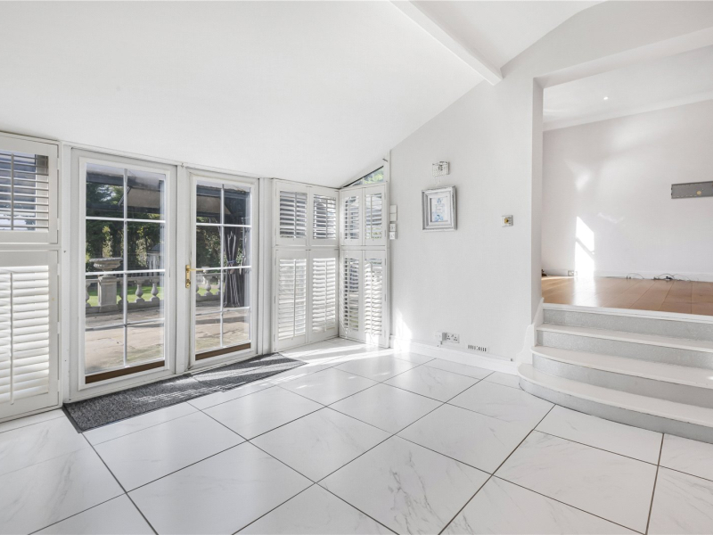 The kitchen flows into three generous reception rooms, two of which offer beautiful views across the rear garden. A fourth reception room enjoys dual-aspect views to both the front and back of the property, with direct access to the garden and a second staircase to the upper floor.
