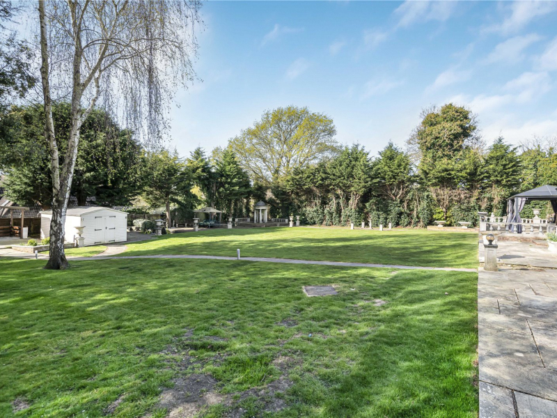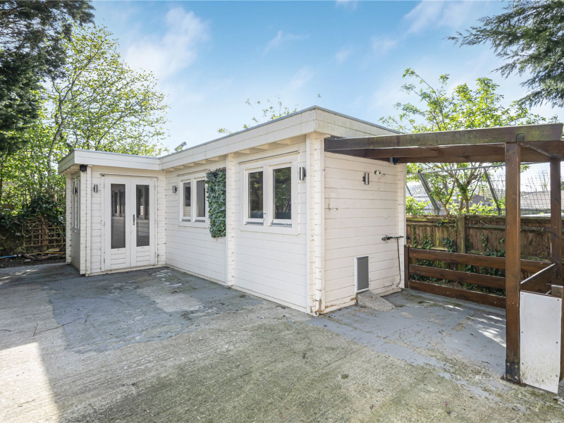 The south-facing garden is truly a standout feature — beautifully landscaped and offering complete privacy, bordered by mature shrubs and hedging. A generous rear terrace is perfect for al fresco dining, while additional terraced spaces surround a central lawn and an ornamental fish pond. There is also a detached studio with lighting and electricity, ideal for use as a home office or creative space, along with multiple garden stores.