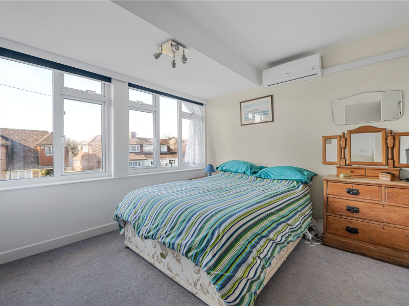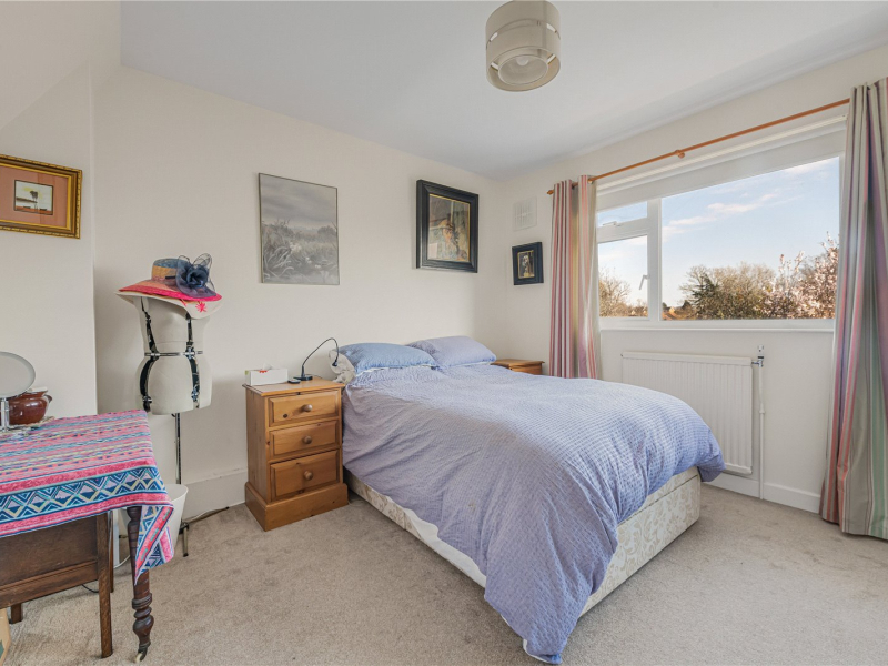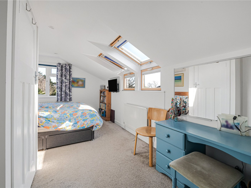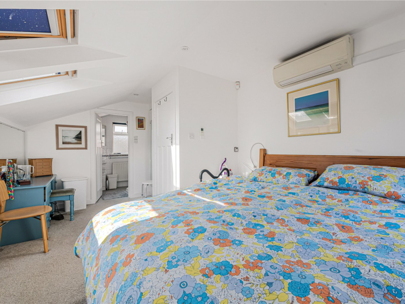 The second floor offers a spacious double bedroom with access to eaves storage and attractive views over the rear garden, also benefitting from air conditioning.