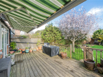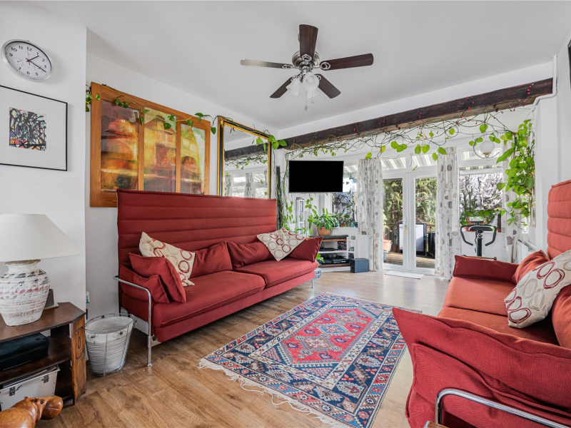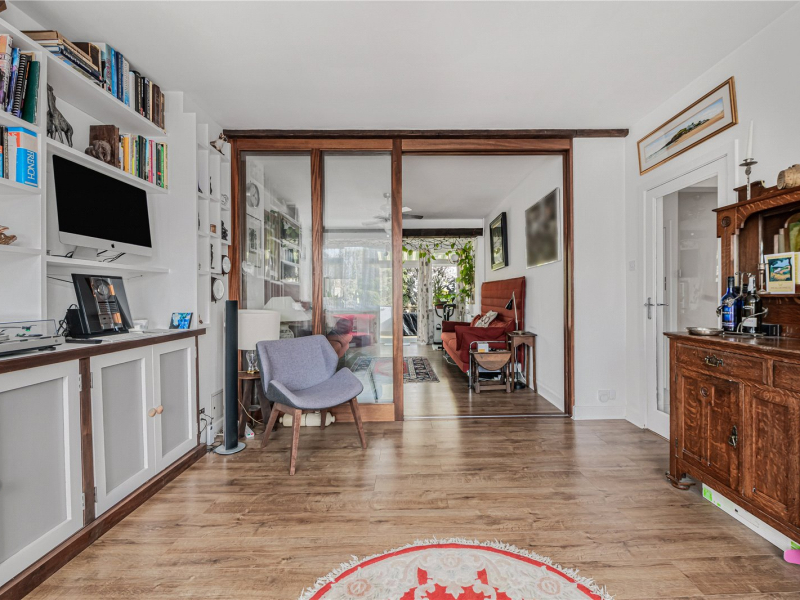 To the left is the spacious living/dining room, benefitting from dual-aspect windows which create a bright and airy feel. Glass sliding doors divide the space, offering the flexibility of open-plan living or a more separate arrangement. French doors open onto the decking and garden, seamlessly blending indoor and outdoor living.
