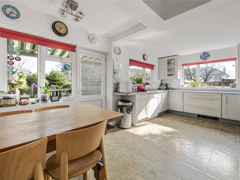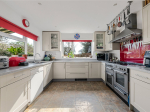 The kitchen has been neutrally decorated and offers space for a dishwasher, fridge/freezer, and Rangemaster cooker, along with ample over- and under-counter storage. A door from the kitchen also opens onto the decking and garden, providing further convenient outdoor access.