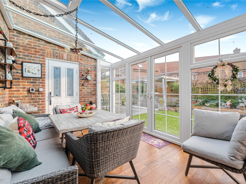 The sun room provides a fantastic additional reception space, perfect for extra seating or relaxation, and offers internal access to the double garage.