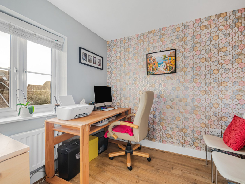 The second floor benefits from two generous double bedrooms, both fitted with built-in wardrobes, and a further bathroom fitted with a bath, walk-in shower, WC and sink. Eaves storage is also available on this floor.