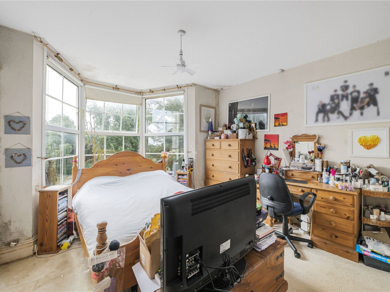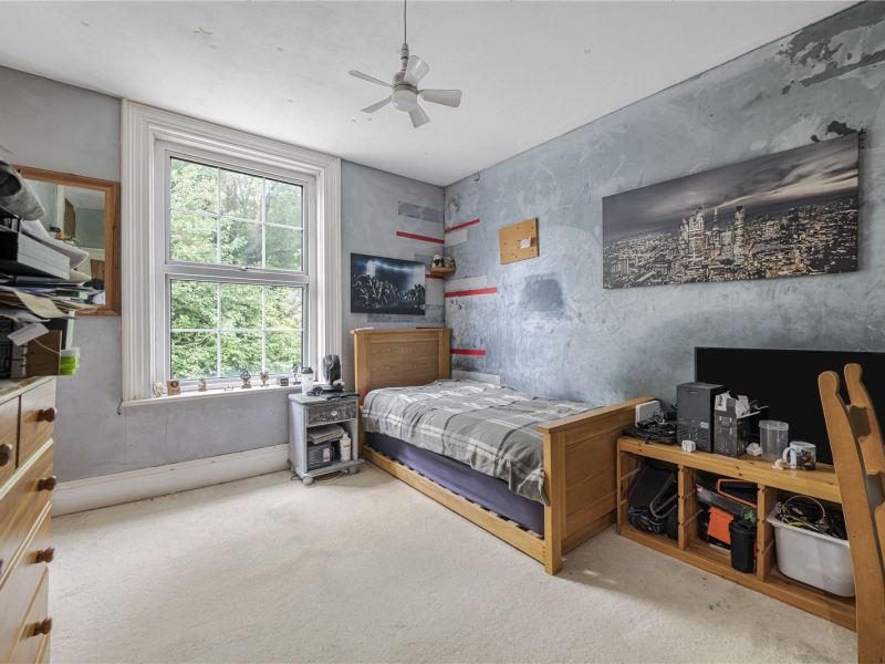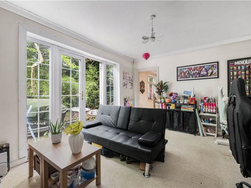 From the kitchen, a rear hallway leads to a bathroom, airing cupboard, another reception room with French doors to the garden, and a generously sized double bedroom. This entire section of the home benefits from its own entrance and could be reconfigured to create a self-contained annexe.